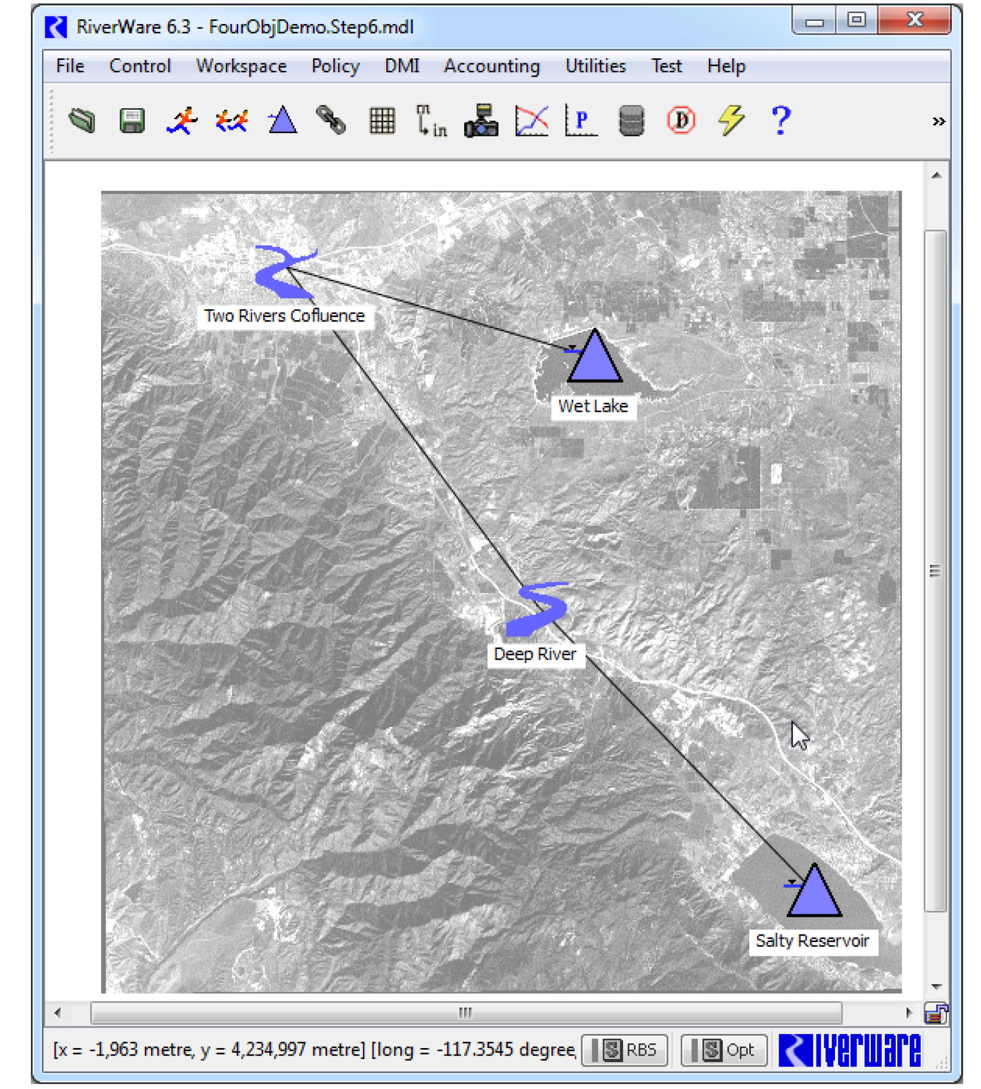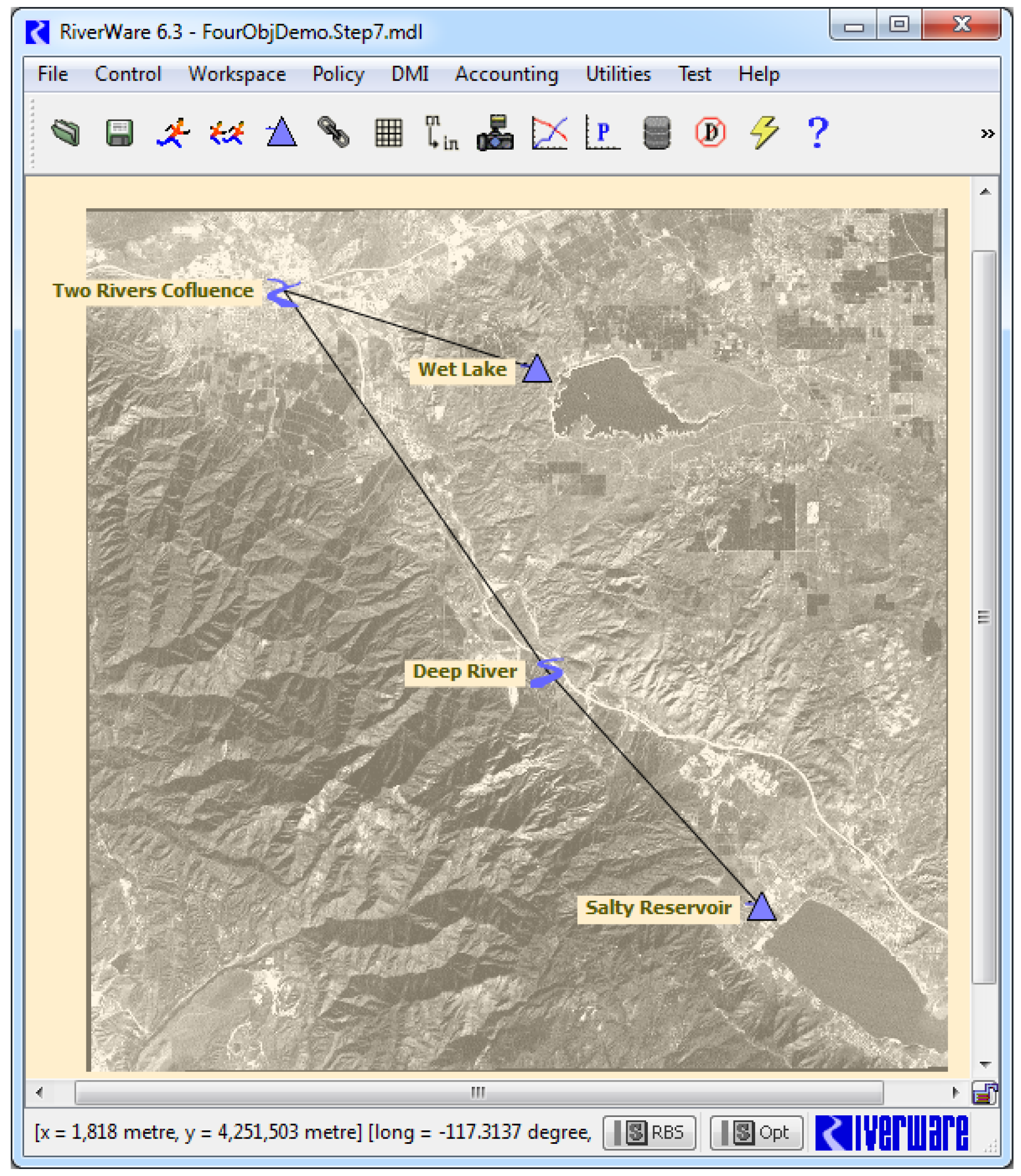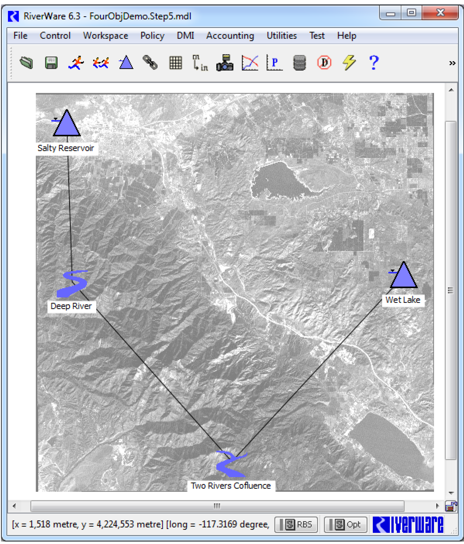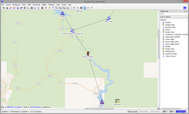 The Geospatial View of the workspace provides a spatially coherent display of the modeled basin by associating a map projection and its Cartesian coordinate system with the view. Locate objects and a static background map image in this coordinate system, allowing RiverWare to display a schematic view of the modeled basin overlaid in registry with the map. That is, RiverWare objects are displayed at their location on the map. By providing an intuitive and information-rich view of a basin, the Geospatial view complements the Simulation and Accounting views of the workspace.