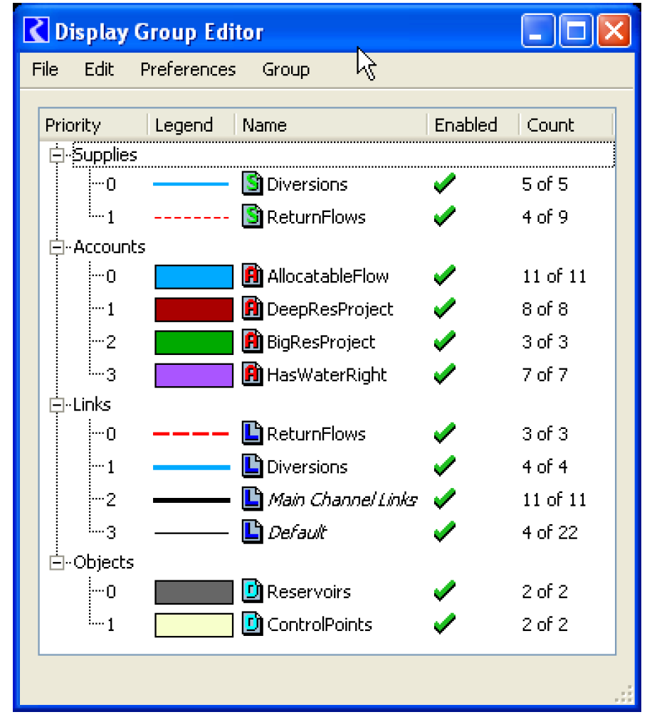 This brings up a window with the option to select Display Group Properties.The Display Group Editor provides the ability to create groups of links, groups of objects, and if accounting is enabled, groups of supplies and groups of accounts. The display properties and the membership of a group can be changed by double-clicking that group. The membership of the groups need not be mutually exclusive. The groups are prioritized. For example, if two link groups contain the same link, the group highest in the list (lowest priority number) will be used to set the display properties of that link. Display groups can be enabled and disabled by selecting the checkmark in the Enabled column.