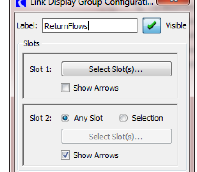 Equivalently, links can be added to a link group within the Display Group Editor. This approach allows multiple links to be added to a link group at once. By double-clicking the desired link group, the Link Display Group Configuration window is opened. The slot on one end of the link is selected by selecting Select Slot(s) in the Slot 1 field. If the Any Slot toggle is selected in the Slot 2 field then all links to any of the slots listed in the Slot 1 field will be associated with the display group. While the Link Display Group Configuration dialog does not display the links associated with a particular group, the slot selector dialog remembers the selected links. Therefore, the user can view the links associated with a group by selecting the Select Slots(s) button. To make a more specific selection of links, slots can be selected in the Slot 2 field if the Selection toggle is enabled. Only those links that are connected to a slot in the Slot 1 field and the Slot 2 field will be associated with the display group.