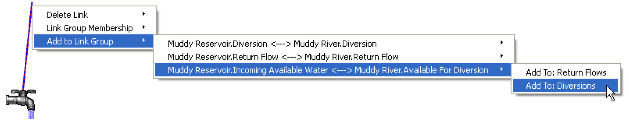 From the Workspace, a link can be added to link group by right-clicking the link(s) between two objects, hovering over the Add to Link Group option, hovering over the desired link (there can be multiple links on the same line between two objects), and selecting the desired Add to: <link group>.