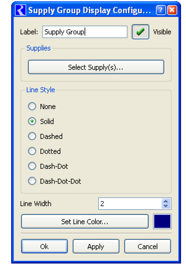 Supply groups are active only if accounting is enabled. A supply group can be created by selecting Group, then Add Supply Group in the Display Group Editor. Double-clicking the new supply group entry will bring up the Supply Display Group Configuration dialog. The membership of the group and the line style, color, and width of the group members can be set with this dialog. The membership of the group is controlled by selecting the Select Supply(s) button. See Supply Groups in Accounting for details on Supply Groups.
