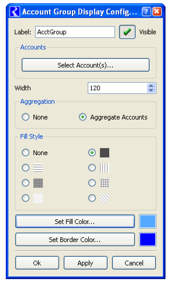 Account groups are active only if accounting is enabled. An account group can be created by selecting Group, then Add Account Group in the Display Group Editor. Double-clicking the new account group entry will bring up the Account Display Group Configuration dialog. The membership of the group and the fill style, fill color, account width, account aggregation, and border color of the group members can be set with this dialog. The membership of the group is controlled by selecting the Select Account(s) button. If account aggregation is selected, the selected accounts, on a particular simulation object, will be collapsed into one icon. The icon will appear as a stacked group of accounts to indicate the presence of more than one account. An account can also be added to an Account Display Group by right-clicking the account on the workspace, hovering over Add to Account Group, and selecting the desired Account Display Group. If the account is already a member of an Account Display Group, this option will be replaced with Account Group Membership. Hovering over this option will show the display group to which the account belongs. See Account Groups in Accounting for details on Account Groups.