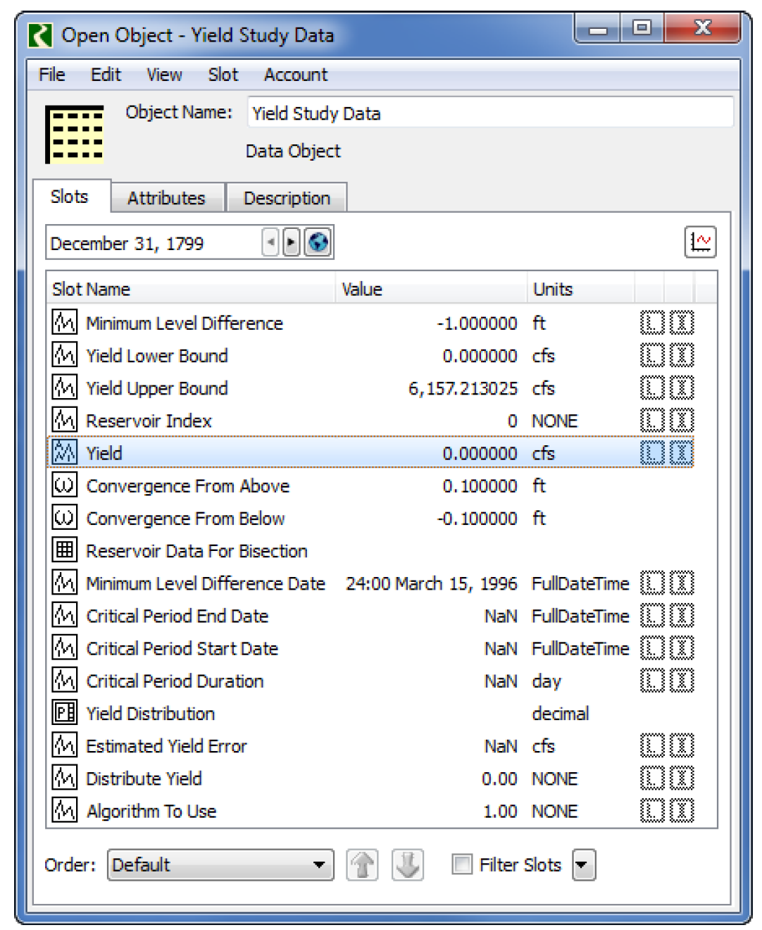 This section provides instructions to convert an existing working USACE‑SWD model into a yield study using iterative MRM. A yield study is used to determine the largest average diversion that can be made from a single reservoir such that the reservoir will not drop below the bottom of conservation pool at any time during the run period. Other operating policies like Surcharge, Regulation Discharge, Flood Control, Low-flow Release, and Hydropower can be included in this analysis. The following files are needed for this analysis.