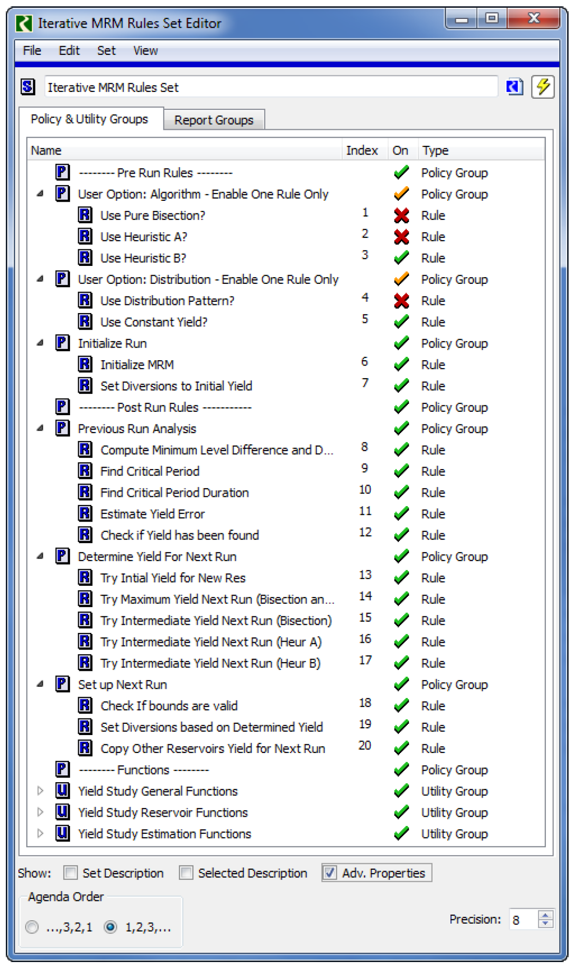 d. Set the Agenda Order of the MRM ruleset to “1,2,3,..”. This is done from the MRM Rules - Ruleset Editor View, then Show Advanced Properties menu. The Agenda Order is controlled by two toggles added to the bottom of the dialog.