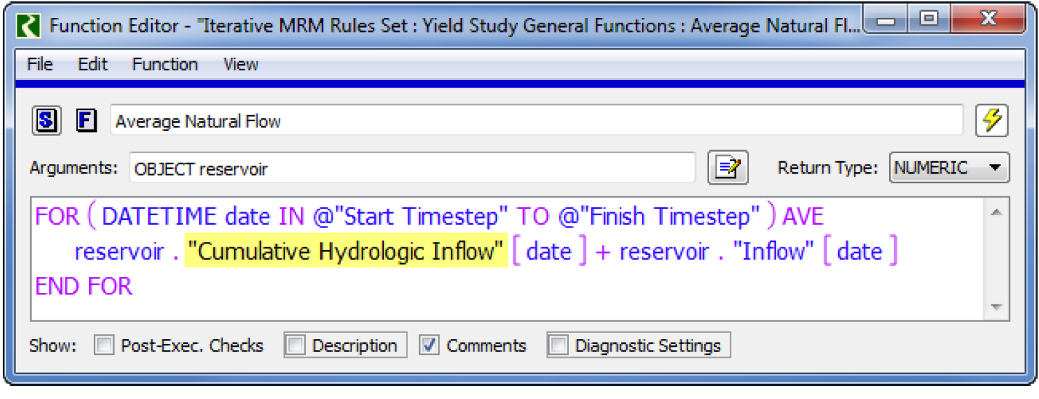 Note:  If you are computing the maximum yield, you may need to change the function Average Natural Flow to access the correct hydrologic inflow slots. It should reference the slot with input data.