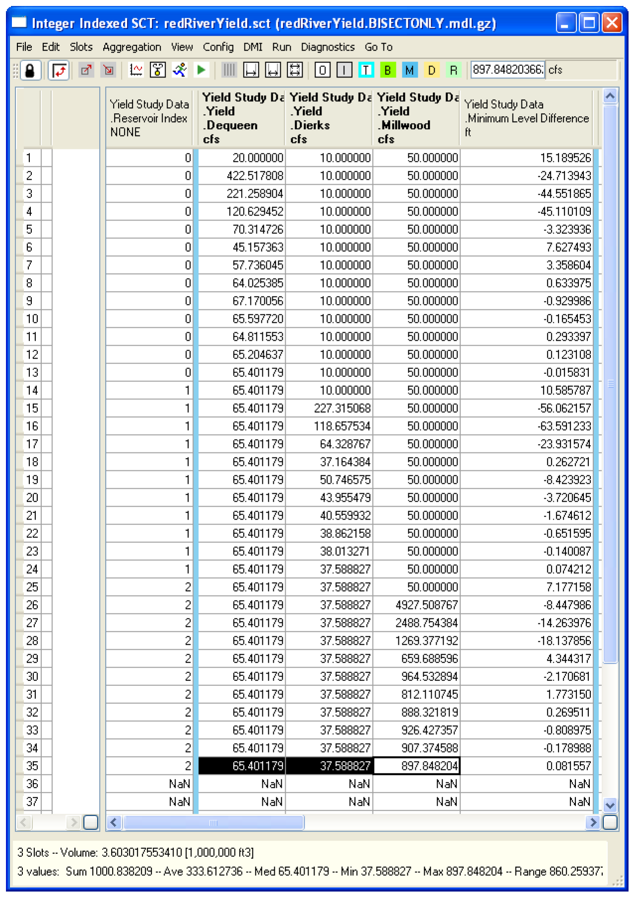 Note:  The yields are average values, while the distributed values are set on the Reservoir.Diversion slot and can be viewed there. To determine the total yield, highlight each of the individual yields as shown and the sum is displayed at the bottom of the SCT. The SCT also contains (not shown) the bounds used in iteration and the critical period found for each run. At the end of the iterative run, the critical period can be found on the row in which that reservoir converged, i.e. 13, 24, and 35.