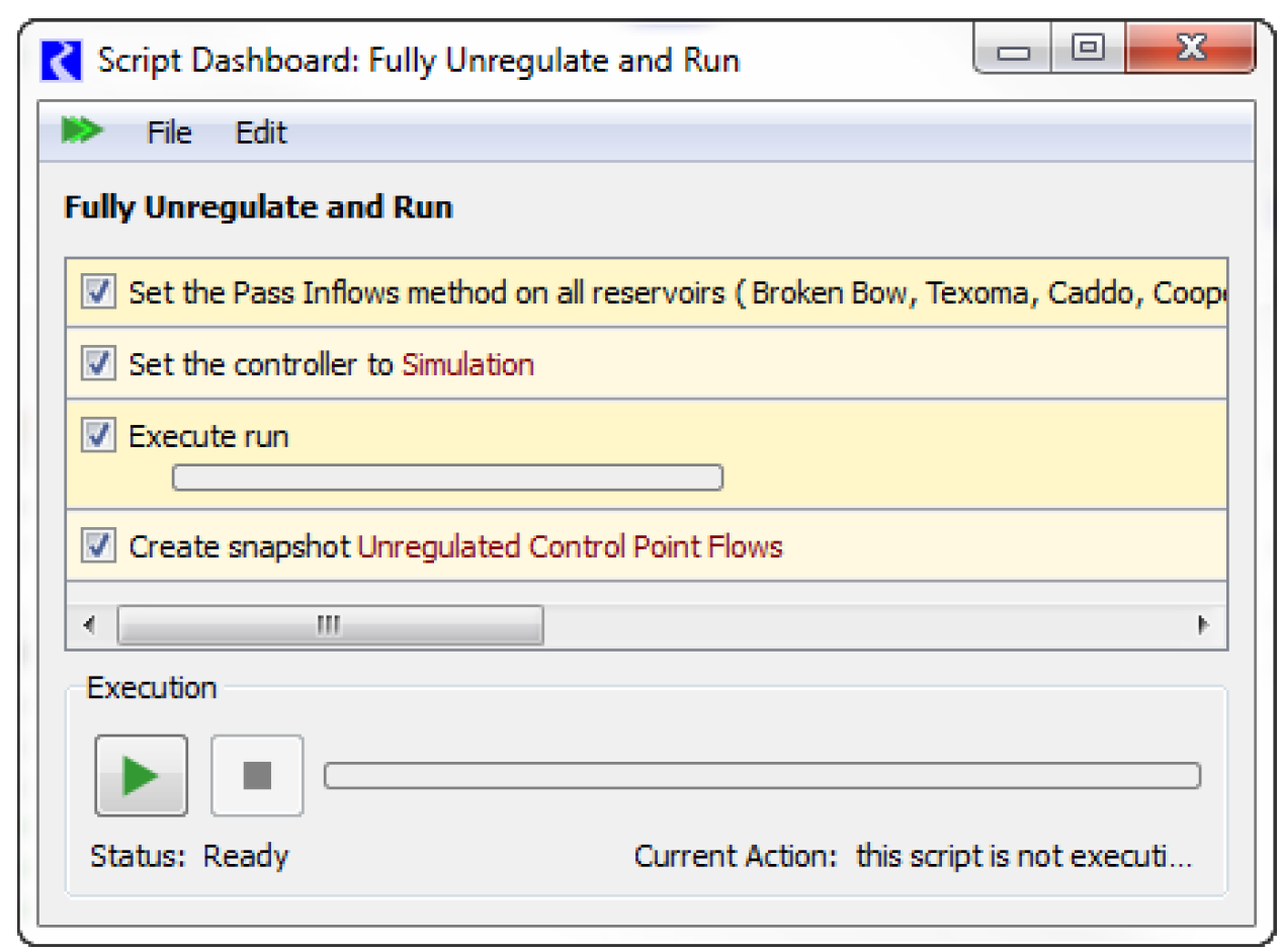Although these two applications are similar and use the same approach, they will use different scripts. The fully unregulated system is essentially a pure simulation with no rules needed. For the partially unregulated system, rules are necessary and those rules and the flood control algorithm must know how to deal with a disabled reservoir. The partially unregulated run requires the user to select or describe what they want to model, so is more complex and warrants a different script.