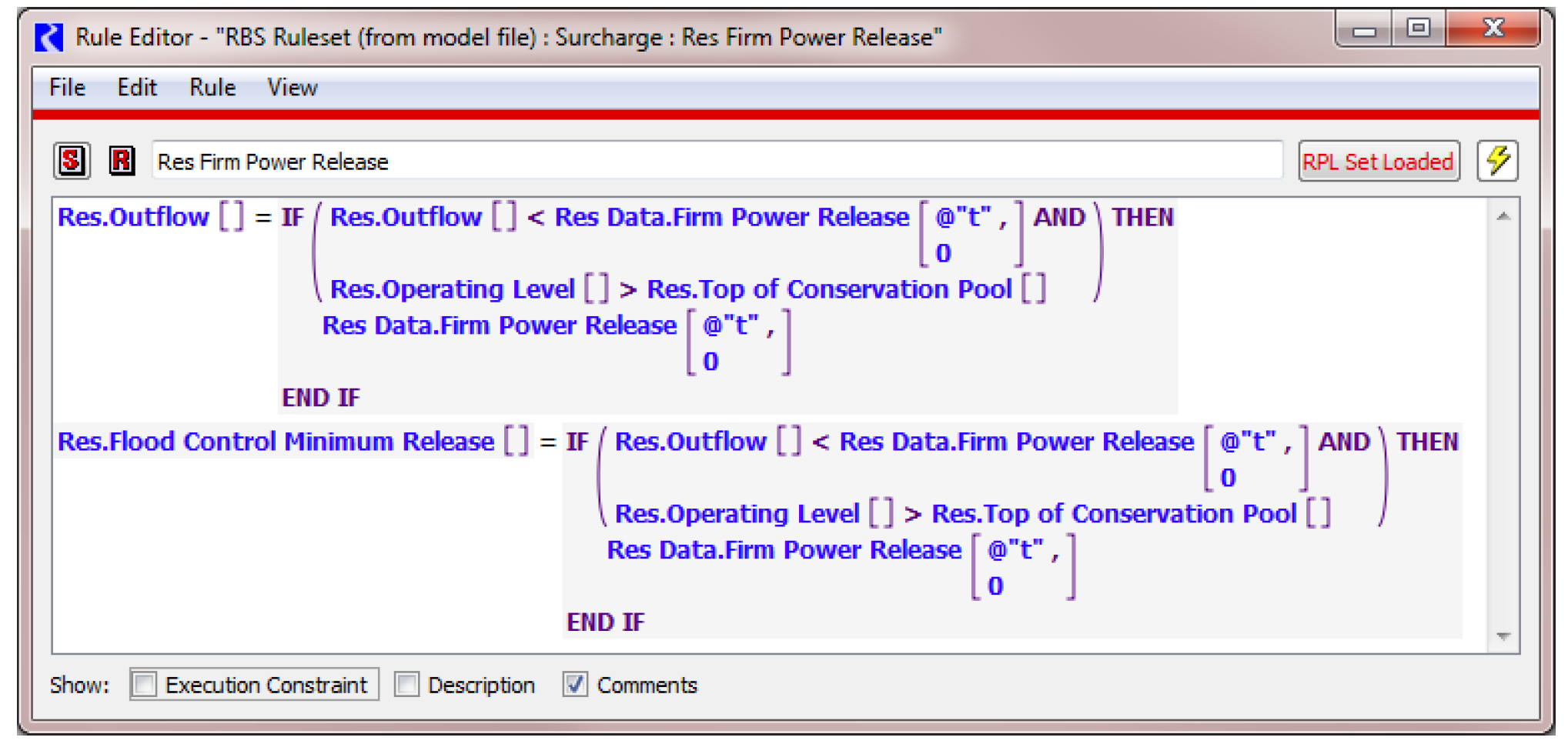 In this sample rule, the current Outflow and Flood Control Minimum Release is set to the Firm Power Release when the current Outflow is less than the Firm Power Release and the Operating Level is above the Top of Conservation Pool.