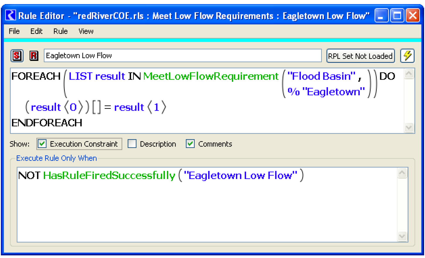 Figure 3.6 shows a sample rule that meets the Eagletown low-flow requirement using the computational subbasin name FloodBasin. The execution constraint forces the rule to execute only once.