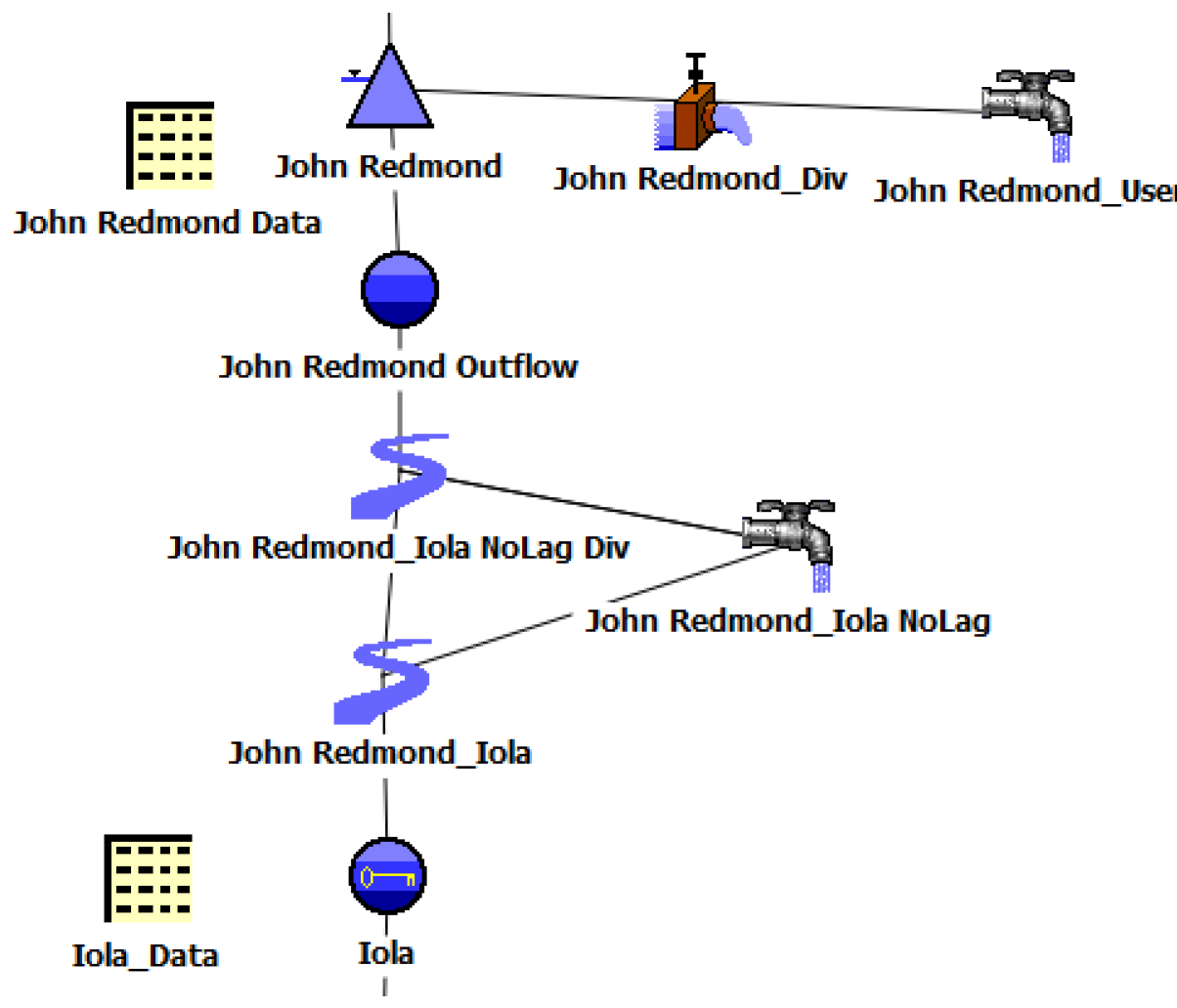In the case where a reservoir provides low-flow releases to two (or more) downstream control points, this structure must be created around each routing reach between the reservoir and the lowest control point. Flows destined for low-flow demand at the lowest control point should pass through secondary flow paths created for flows destined for control points higher up in the river system. It is not necessary to create more than one secondary flow path around a single routing reach, the rules will determine the quantity of water to divert through the secondary path. For this setup (in the initial implementation), each reservoir should have a companion data object. On the data object, you should add slots to hold the low-flow releases for each downstream control point: Reservoir Data.LowFlow for CP. For example, there may be a slot “John Redmond Data.Low-flow Release For Iola”