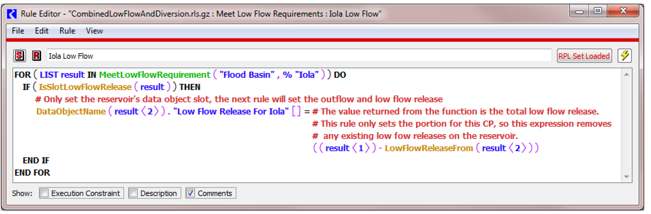 c. The RPL function returns a list of paired items, the Low-flow Release slot and the value to be set on the slot (for each reservoir). The rule makes the assignment to the Low-flow Release slot. The new Outflow and Outflow slot is also returned by the rule function. A ForEach statement is used to make the assignments.