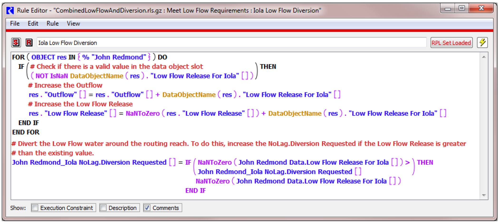 Figure 3.8  Sample rule to compute low flows needed and set it on a data object