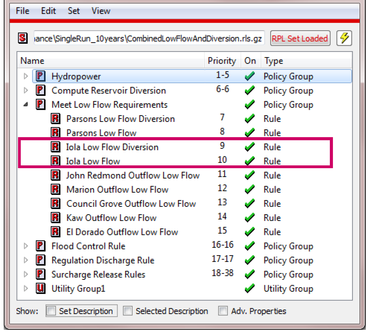 A rule will need to be created for each control point that has a low-flow requirement. In the rule, a predefined RPL function, MeetLowFlowRequirement, is used to compute the required low-flow releases for each reservoir. The function will take a computational subbasin and a control point as an argument. See MeetLowFlowRequirement in RiverWare Policy Language (RPL) for details.