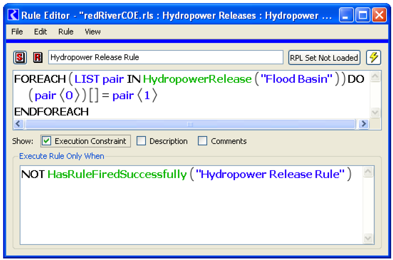 Figure 3.14 shows a sample rule that meets the HydropowerRelease using the “Flood Basin” computational subbasin. The execution constraint forces the rule to execute only once.