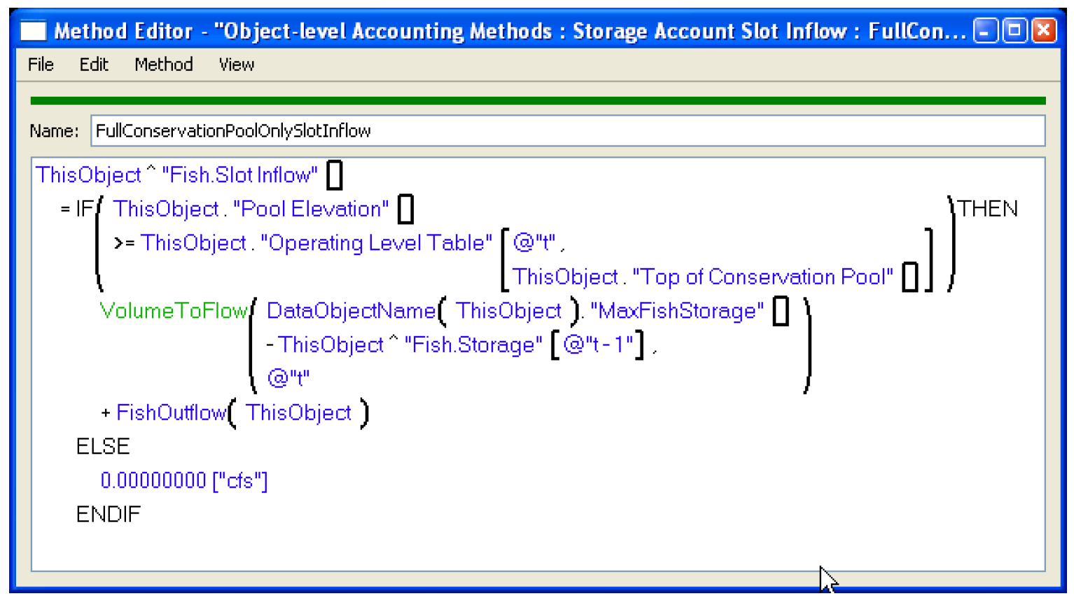6. Develop User Defined Accounting Methods that describe the logic used to account for Evaporation losses. Evaporation losses on any day is calculated as the current fish storage divided by the current total conservation storage times the current day total evaporation loss.