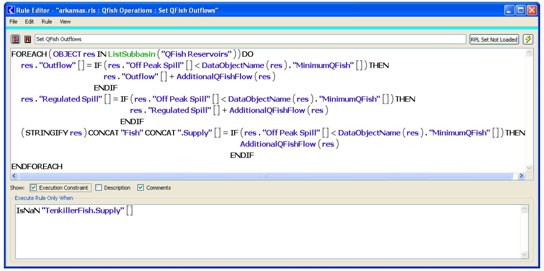 1. A Fish rule fires and checks to see if the off-peak spill is enough to meet the fish requirement. If not met, the outflow is increased to meet the requirement limited by available fish water. Another assignment will set the outflow supply from the Fish account and the bypass or regulated spill slot.