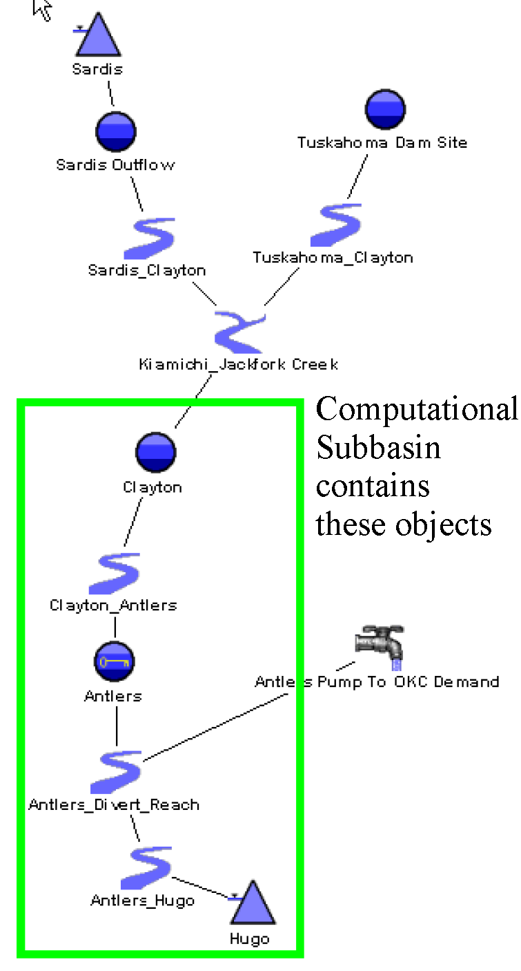 Users will first need to set up a computational subbasin for each group of control points and reservoirs that contain cumulative local inflow data. The computational subbasin(s) must include all control points and reservoirs which contain the cumulative local inflow data as well as all the intervening reaches and confluences. Each control point and reach should only be included in one reservoir's subbasin. For example, in Figure 2.3, there is a subbasin that contains Clayton, Clayton_Antlers, Antlers, Antlers_Diver_Reach, Antlers_Hugo, and Hugo. The subbasin does not go upstream any further because Sardis Outflow and Tuskahoma Dam Site either have no locals or the locals are already included in Outflow.