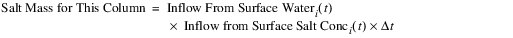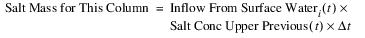 Inflow from Surface Water enters or leaves the upper layer. Inflow from Surface Water is a Multi Slot, and each column can be either negative or positive. Thus, the following computation must be performed on each column, i, of the slot. There must be an associated linked salt concentration for each flow, as follows:
