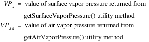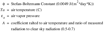 The values of the Stefan-Boltzmann constant and A are constants or internally set variables. Ta is user input through the Air Temperature slot, and air vapor pressure is returned by the getAirVaporPressure method (see below).