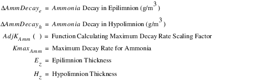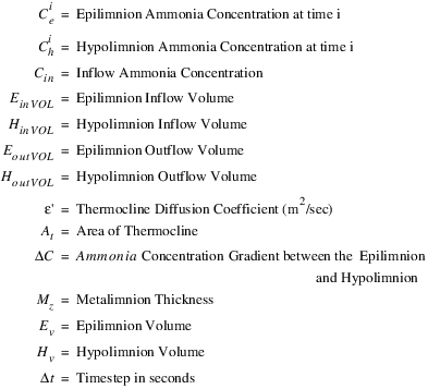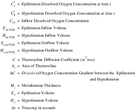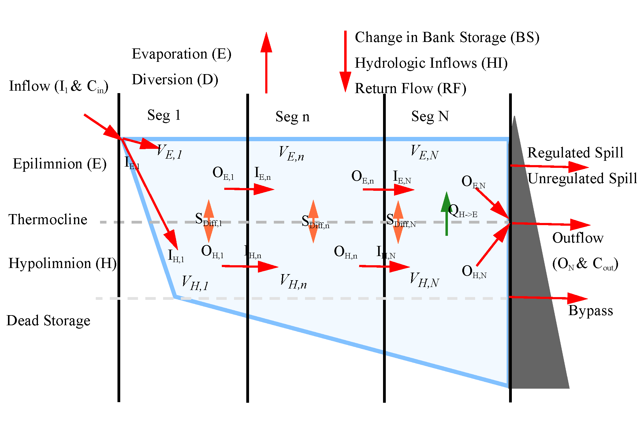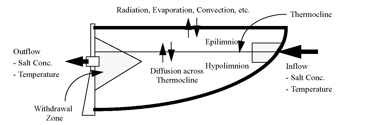 The epilimnion and hypolimnion salt mass and concentration for each segment are computed from a mass balance on salinity. Water and salinity can flow in or out of the bank storage, up or down vertically between the epilimnion and hypolimnion through diffusion and vertical flow, and in and out of each longitudinal segment. The following equations account for the different flow directions of salinity in the mass balance.
