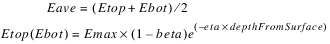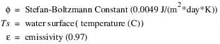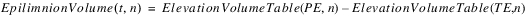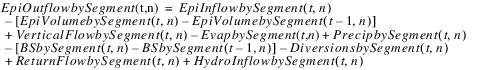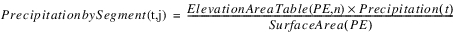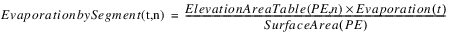 The evaporation leaving each segment and the precipitation entering each segment is based on the proportion of total surface area in each segment. The proportion of total surface area in each segment is calculated using the Elevation Area Table by Segment. The following equations calculate the evaporation and precipitation in each segment, n.