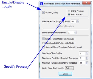Enable water quality modeling on the Run Control parameters dialog. From Run Control, select either View, then Simulation Run Parameters or View, then Rulebased Simulation Run Parameters, depending on the selected controller. Check the Water Quality box to enable the methods.