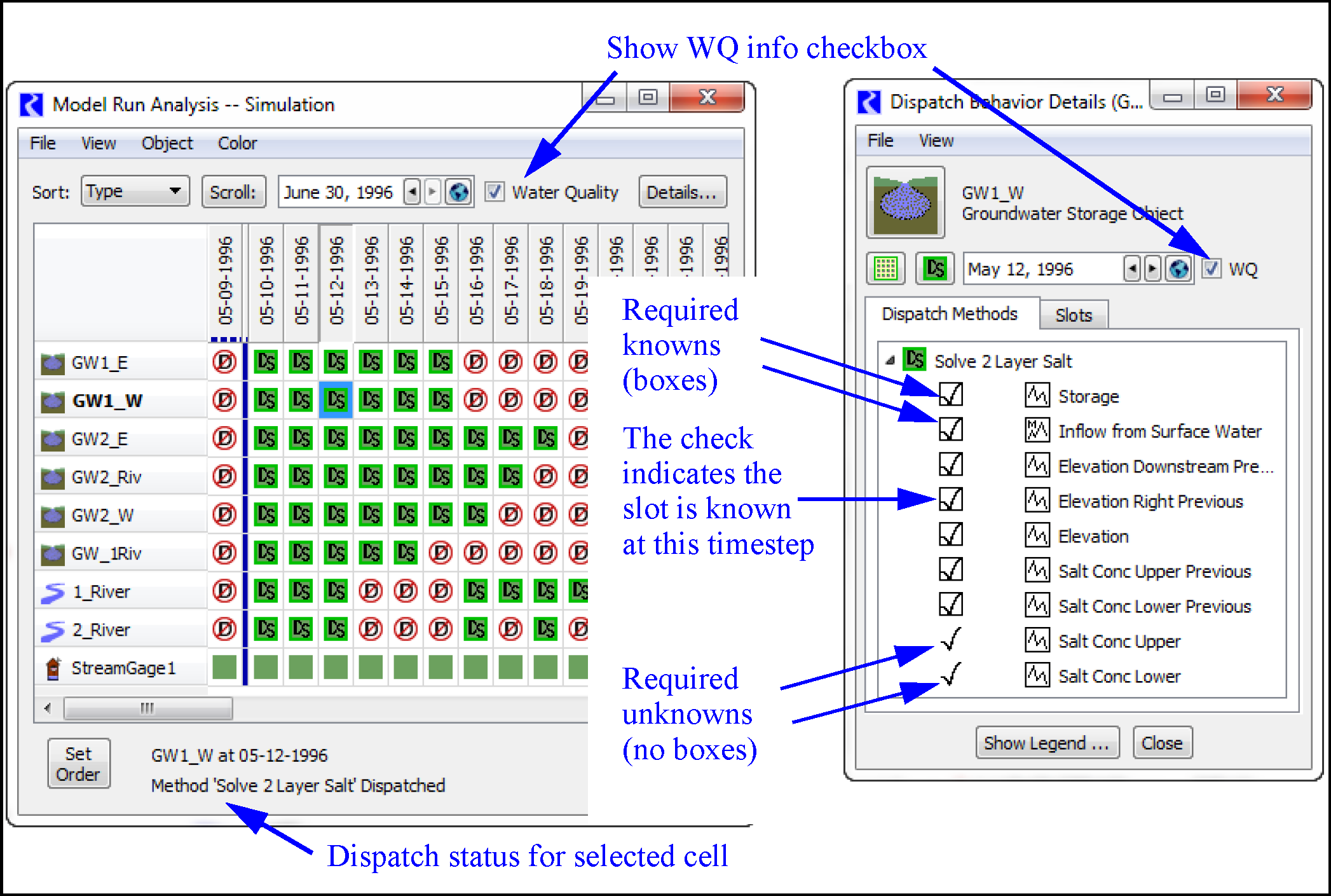 The Model Run Analysis tool is used to show dispatching information. See Simulation in Debugging and Analysis for a general description. This utility by default shows object dispatching information for the water quantity solution. When Water Quality is enabled as described above, a Water Quality checkbox is shown on the main Model Run Analysis dialog. When checked, the dialog shows dispatch information for the water quality solution. Double clicking on a cell opens the Dispatch Behavior Details dialog. This dialog has an analogous WQ check box. This details dialog shows the required knowns and unknowns for each dispatch method and the known and unknown status of each slot.