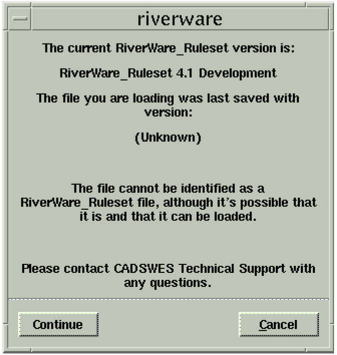 Even though the dialog box says that the file cannot be recognized as a RiverWare ruleset, it will recognize it when the Continue button is clicked. Then, once the ruleset is saved in the new release, it will have a version number and you will not see this message again.
