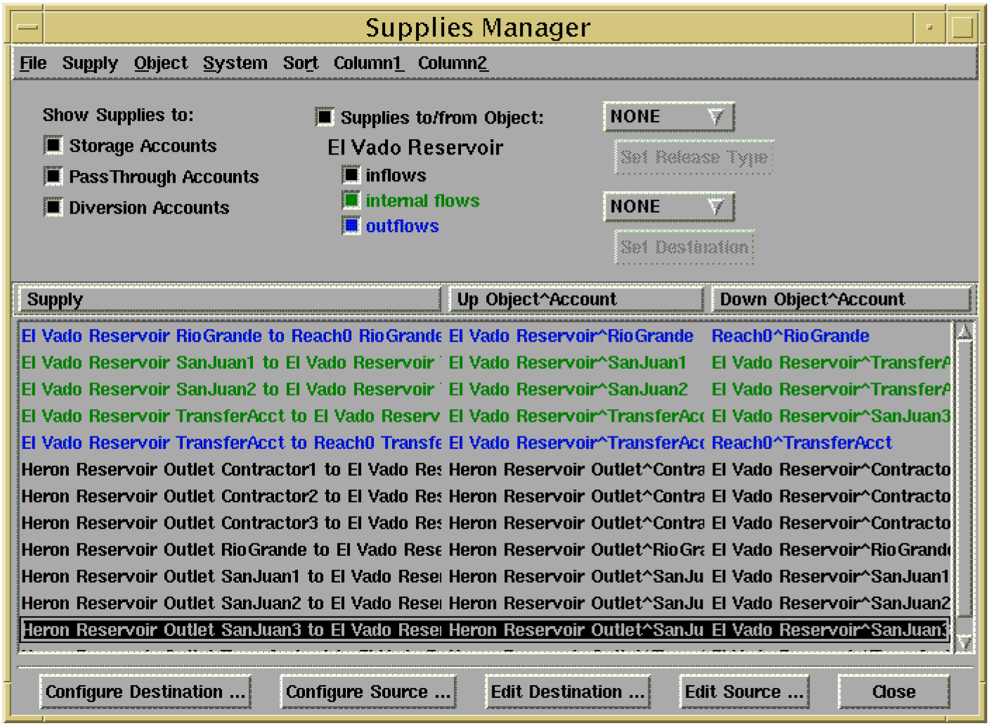 The new Supplies Manager dialog box provides an overview of the accounting Supplies in a RiverWare model. This dialog box can be accessed by selecting Accounting->Supplies Manager from the main RiverWare menu. The user can limit the set of supplies displayed to those to particular types of accounts (storage, pass through, diversion), and to those that are related to a particular engineering object - that is, supplies that are inflows to the object, outflows from the object, and/or flows between different accounts on the object. Color annotation of supply data is used to indicate a certain supply configuration, error condition, and the relationship of supplies to a particular object. The information displayed about each supply, and the order of the supplies presented in this dialog box are configurable by the user. From the Supplies Manager, the user can delete supplies and open various dialog boxes about the two accounts connected by a supply or those accounts’ respective engineering objects. For more information, or details on how to use this dialog, call CADSWES for help.