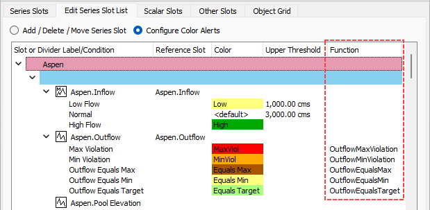 A new column has been added to the Edit Series Slot List tab when the Configure Color Alerts option is selected to show the function that is applied for each condition.