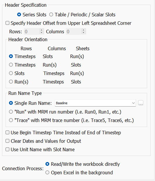 The Header Orientation frame provides four orientation choices for how timesteps, slots, and runs will map to rows, columns, and sheets in Excel. For example, the first orientation as selected in the adjacent screenshot indicates that rows are timesteps, columns are slots, and worksheets are runs.