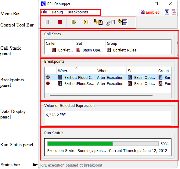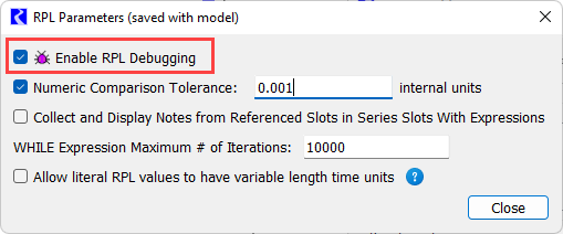 Select the RPL Debugger Enabled/Disabled button to enable or disable. This button remains in place for that RiverWare session. To hide or show the button, use the View, then Show RPL Debugging button. Once shown, you can use this button to enable/disable the debugger. To open the RPL Debugger, select the bug button: