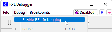 • From the RPL Debugger (Policy, then RPL Debugger), use the Debug, then Enable RPL Debugging menu.