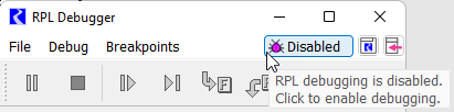 5. Set up breakpoints as needed. This could actually be done at any point. In the initial part of the run, RPL debugging is disabled, so the breakpoints have no effect.
