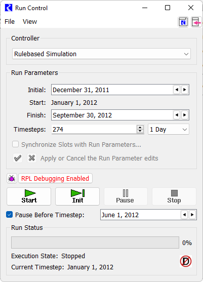 For example, within a rulebased simulation run, you select Step on the Run Control to advance the timestep, use the RPL debugger to break in a rule, step through that rule in the RPL debugger and then select Continue on the RPL debugger. The timestep then finishes and the Run Control will pause before the next timestep.