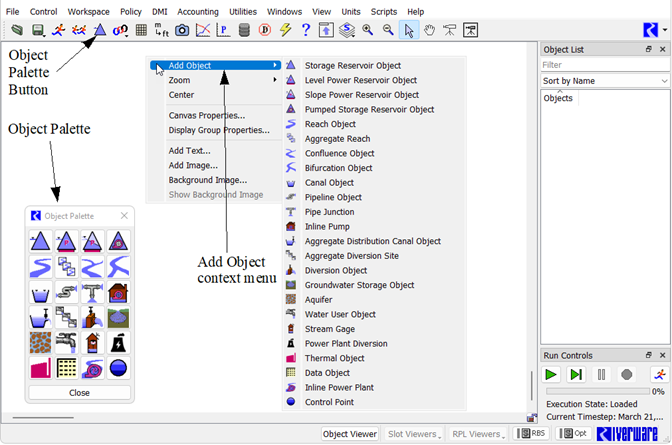 The Object Palette includes all available object types used to represent features of a river basin. To place objects on the workspace, drag them from the Object Palette to the desired location on the workspace.
