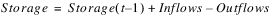The mass balance equation may include the effects of evaporation, bank storage, seepage, or precipitation depending on the selected user methods. Inflow in the mass balance equation is the net inflow to the reservoir, including hydrologic inflows, return flows, and diversions if appropriate.