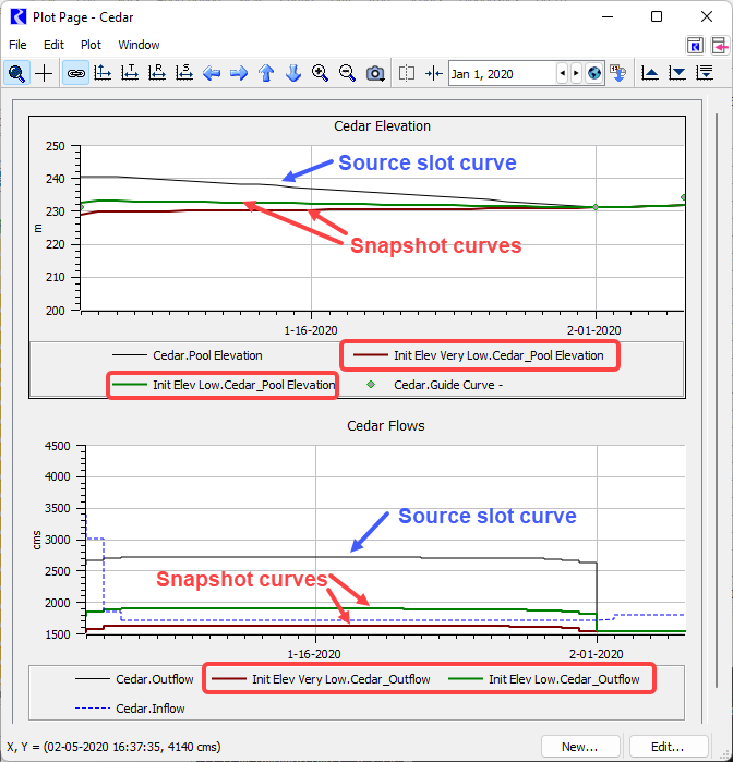 Plot Page Editor applies to the configuration of the Plot Page (e.g., the slots associated with the plots, layout, and line and color choices). Because plots are automatically updated with new slot information (after a new run or after user input values have been changed), a saved Plot Page does not preserve the results of a particular model run. Snapshots can be used to preserve the results of model runs; see