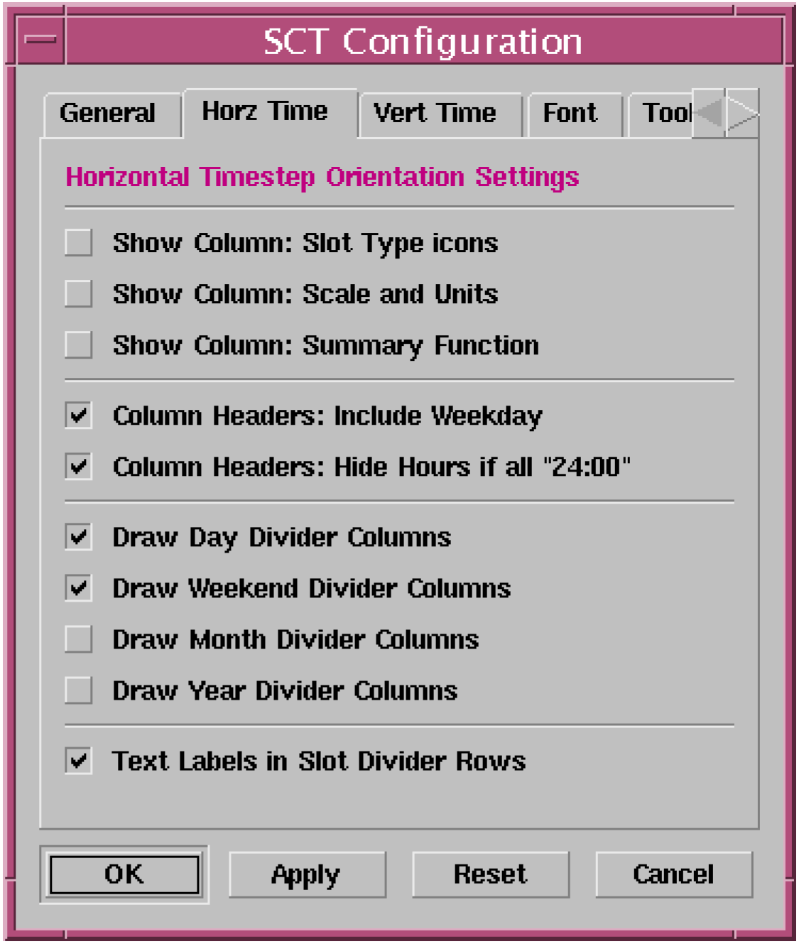 This option is selected for the whole SCT. That is, all slot divider rows (in horizontal timestep axis orientation) can be either tall enough for text labels, or can be drawn as only a thick horizontal line. This selection is made by the user in the “Horz Time” tab of the SCT Configuration dialog box with the following new toggle button: