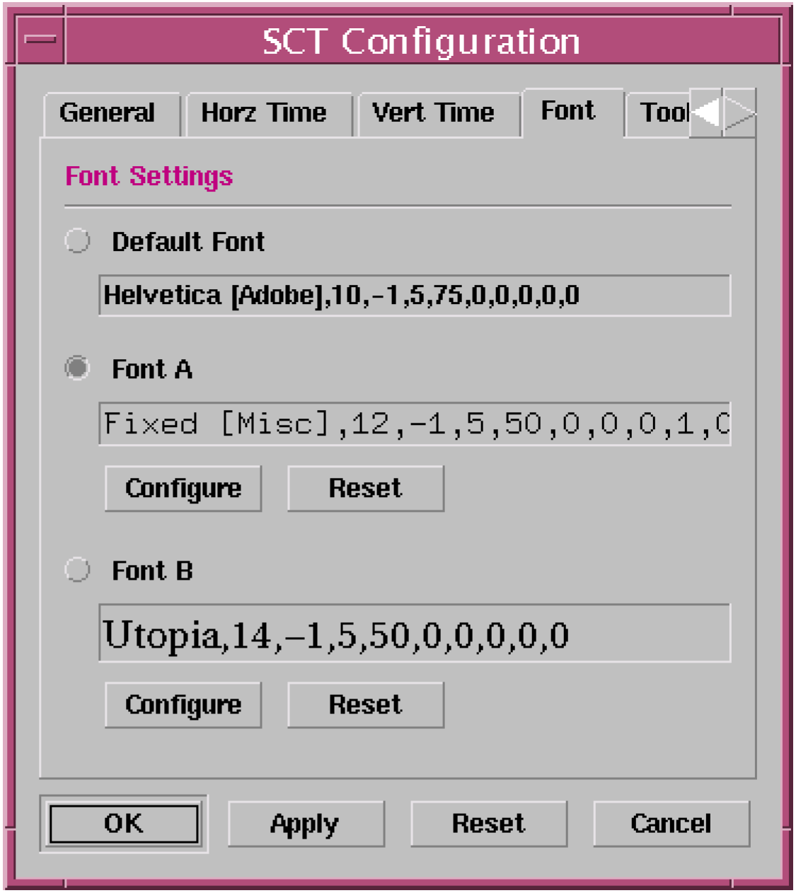 To choose between those three options (Default Font, Font A and Font B), and to configure the font specification for the latter two options, open up the SCT Configuration dialog box by selecting the “View >> SCT Configuration ...” menu item, and select the “Font” tab.
