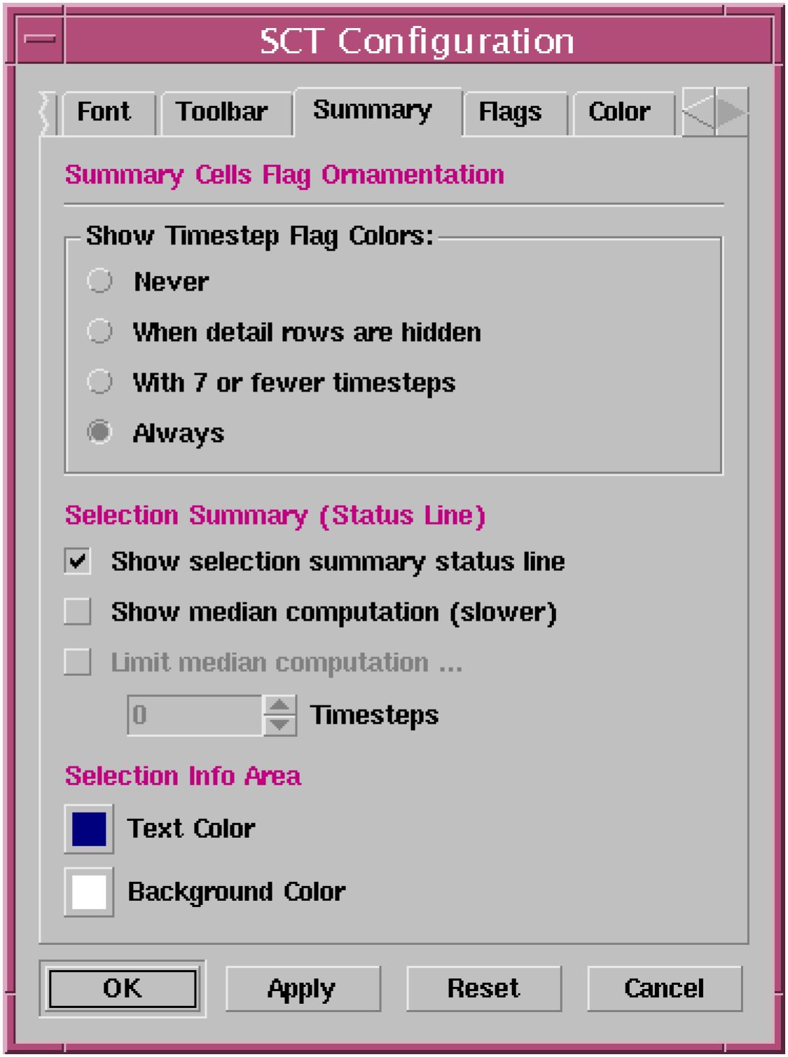 The user can now configure the colors for the Background and the Text displayed in the Selection Info Area at the bottom of the SCT. These colors are chosen from the “Summary” panel of SCT Configuration Dialog Box. Pressing either of these buttons brings up a Color Chooser: