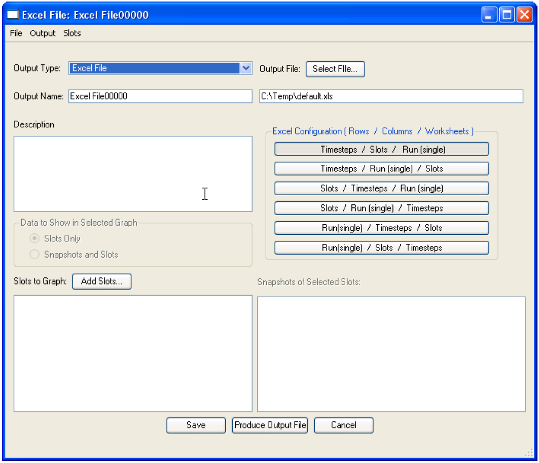 Enhancements were made to allow the user to directly generate Excel files from Riverware (Windows platform only). This is accessed from the Output Manager as a new Output Type. The user must enter an Output Name and select or enter the name of the output Excel file. The user then selects the slots and the desired Excel configuration, i.e. slots as rows, timesteps as columns, runs as worksheets. A screen shot of this feature is shown in the figure. The user no longer needs to create RDF files and use ExcelWriter.