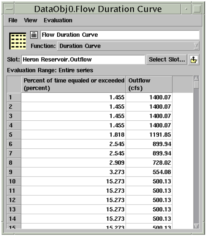 The Statistical Table slot was added to the Data Object. The user selects the desired series slot as input and selects either a Duration Curve or a Max Annual Frequency Curve. The Duration Curve ranks the data in order and calculates the percentage of time each value is equaled or exceeded. The Max Annual Frequency Curve determines the maximum value for each year, then ranks the values and determines the percent exceedence. The user can then plot the resulting statistical data.