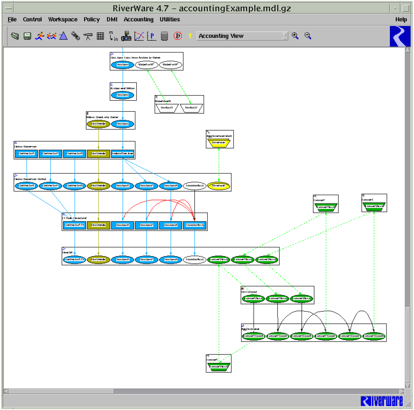 A new feature has been added to RiverWare that allows the user to visualize and build an accounting network. Once Accounting is enabled, a pull-down menu appears on the toolbar that allows the user to switch from the Simulation View to the Accounting View. The first time this action is performed, RiverWare locates the objects according to the simulation view layout. The objects and accounts can be rearranged by dragging them to their new location, which is saved with the model file. Large rectangles represent objects; the icon and name are shown in the upper left. The small rectangles inside the object represent storage accounts, ovals represent pass-through accounts, and trapezoids represent diversion accounts. The arrows represent the supplies. Colors and other display attributes of the objects, accounts, supplies are controlled using the Display Group Editor found on the Workspace menu. Simulation links can be shown from the Display Group Editor -> Preferences menu. A configured display is shown in the screen shot below.