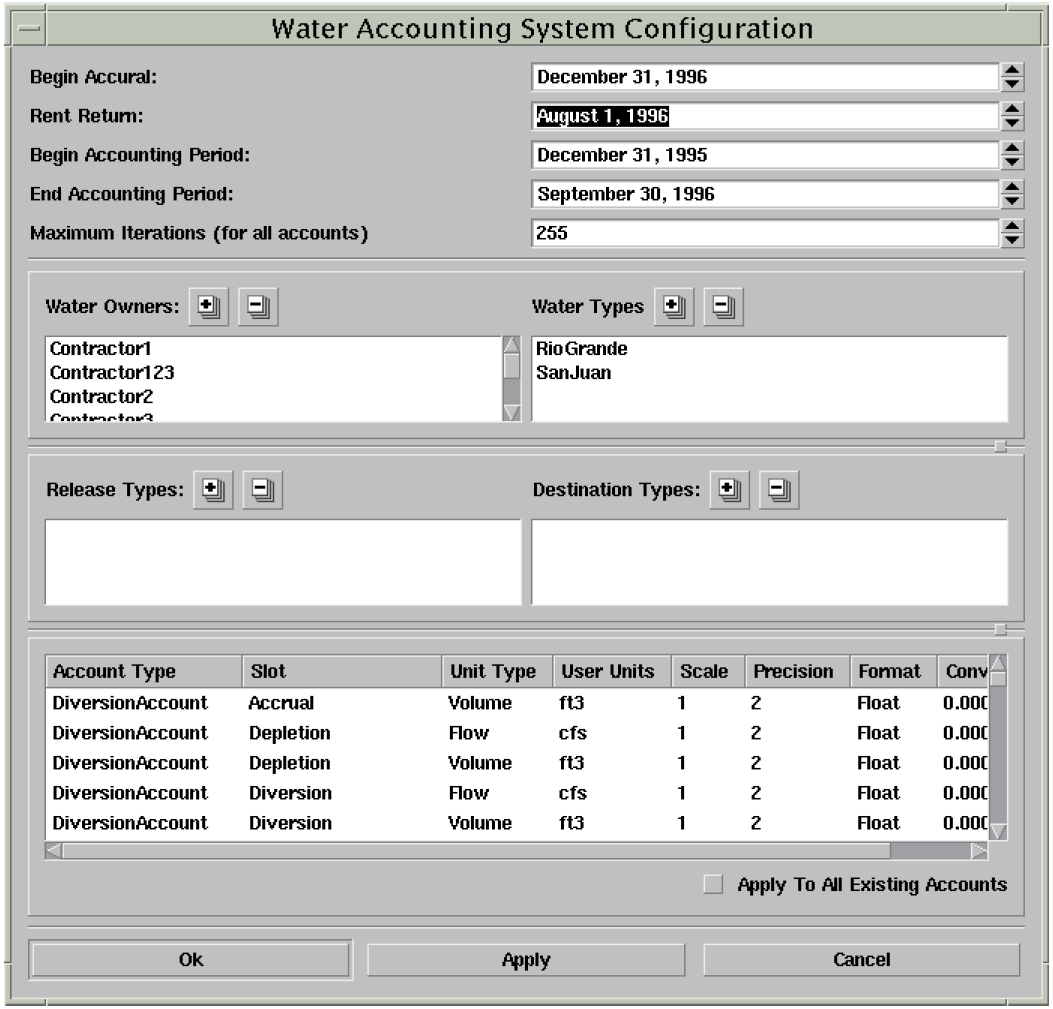This dialog is accessed through the Accounting -> Account System Configuration menu. In the new dialog, there are no longer tabs. Instead, everything is shown in one view. Water Owners, Water Types, Release Types and Destination Types can be added by clicking on the “+” icon or deleted using the “-” icon. User Units, Scale, Precision, Format, and Convergence can be changed by right-clicking on the desired variable.