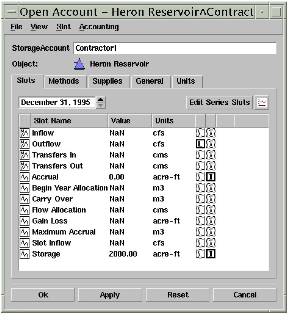 The Accounting View can also be used to view and build models. Double-clicking on the object rectangle or the account brings up the appropriate dialog. New objects can be added using the right-click->Add Objects menu. Supplies can also be added by right-clicking on the downstream account, selecting Add Supply, then right-clicking on the upstream account. More information on this feature is available from the User Interface section of the RiverWare Help.
