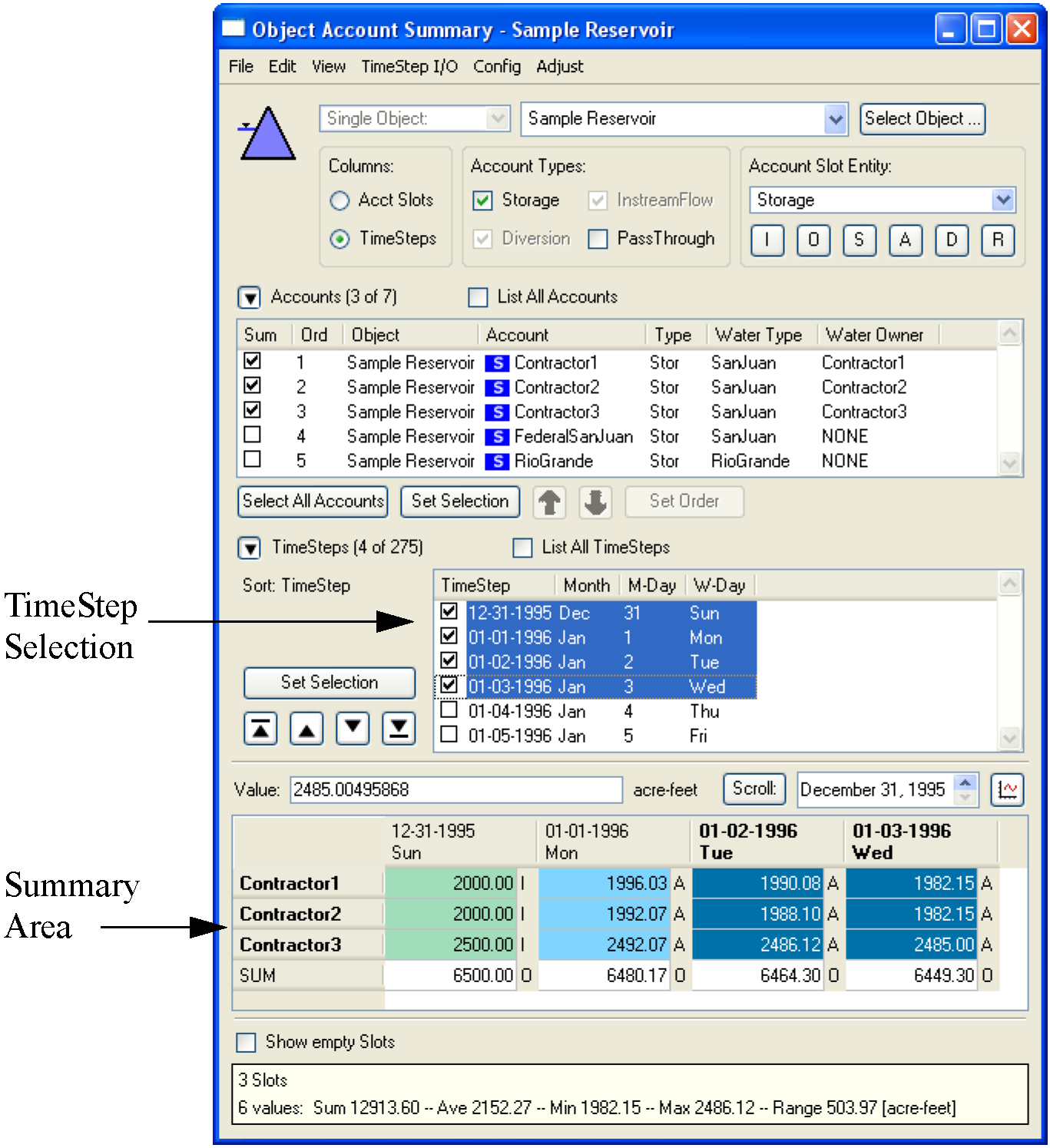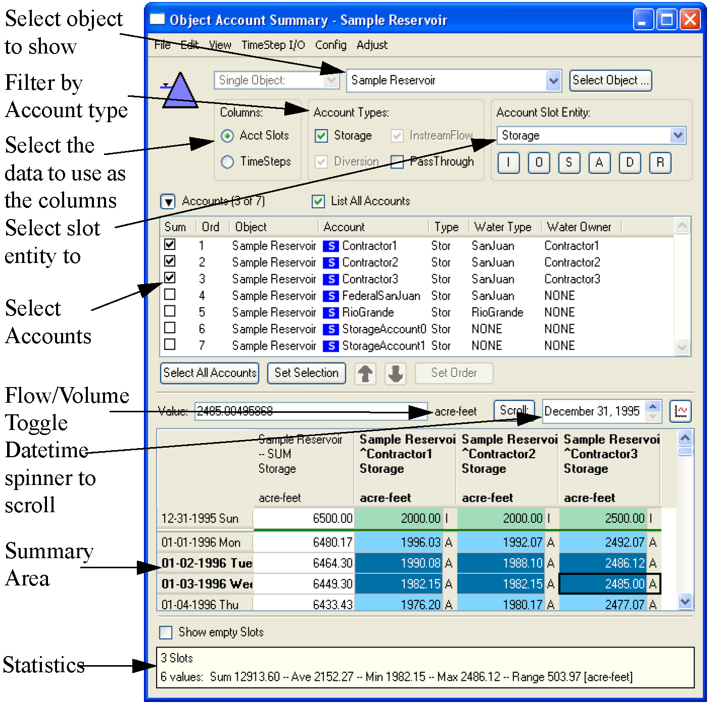 The Object Account Summary Dialog was re-implemented and enhanced. The Object Account Summary Dialog shows summary data about selected accounts on a specified object. For example, the user could select to see the total accounting storage for a given water type. The main difference from the old dialog is that now both the summation and the components of that sum are now shown. In addition, there is enhanced filtering and display functionality. Following is a screenshot showing the new Object Account Summary Dialog and a description of the components of the dialog.