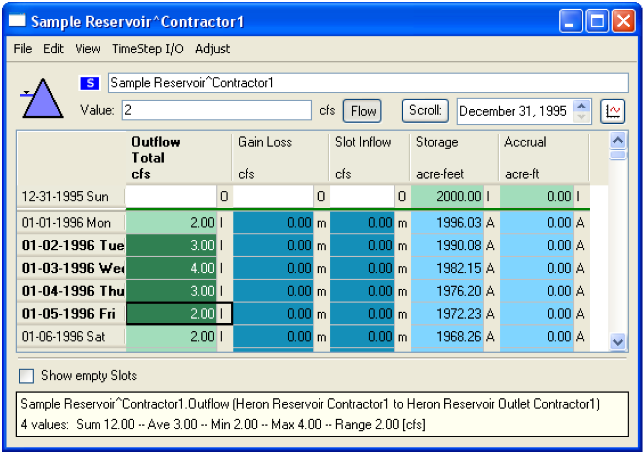 The slot entity (Outflow, Inflow, Storage, etc...) shown in the summary area is selected using the pull-down menu. The most common slot types can be selected using buttons.