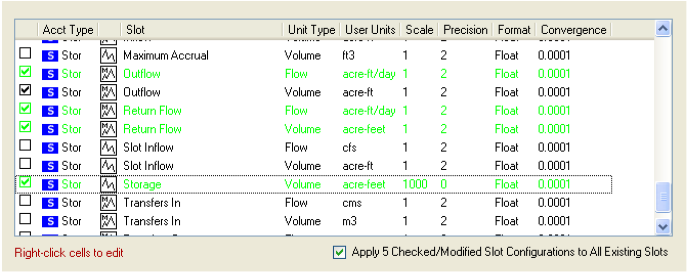 The Water Accounting System Configuration dialog was enhanced to allow the user to better configure many accounting slots at one time. Shown in the following screenshot, the user is now able to use check boxes to select the slots they wish to change. If the “Apply Checked/Modified Slot Configurations to All Existing Slots” toggle is checked, then the configuration edits will apply to all of the checked slots and will change existing slots. If it is not checked, any edits will only apply to slots on accounts added in the future. This feature gives the user much more control over the configuration of accounting slots.