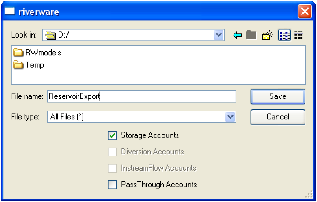Accounts can be filtered by type, i.e. Storage, PassThrough, Diversion, or Instream Flow, using the check boxes.